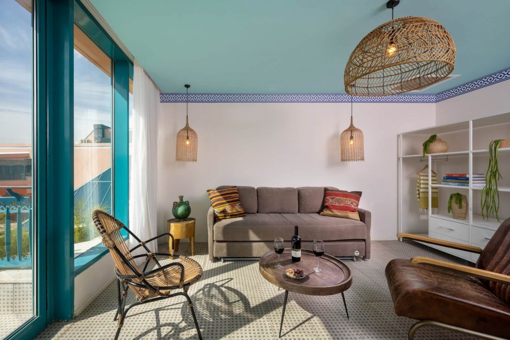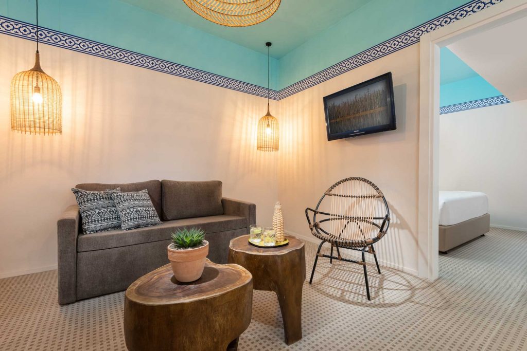Suite design et spacieuses disposant d’une terrasse ensoleillée, d’une chambre, d’un salon et bien plus encore. Les suites sont situées au 2e étage, accessibles uniquement par des escaliers.